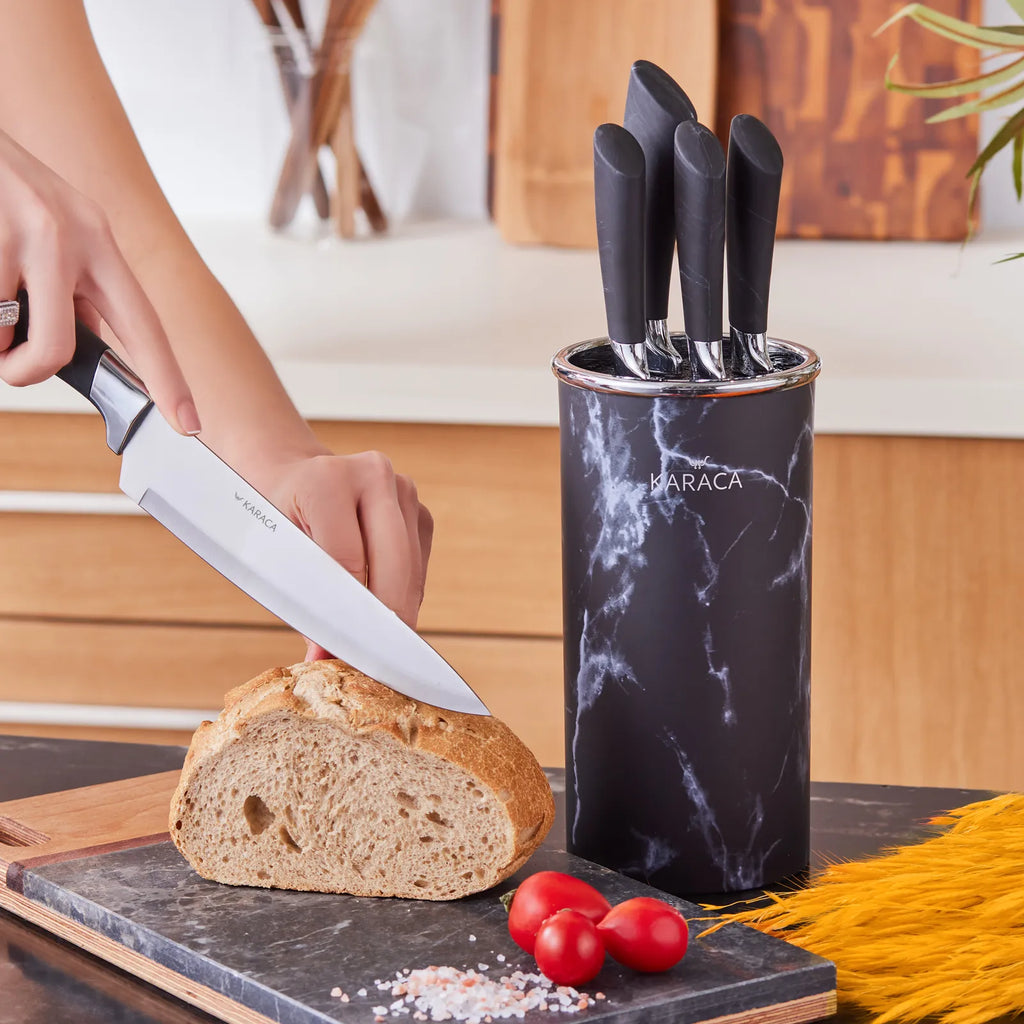 Le set Karaca Black Marble est un ensemble de couteaux professionnels qui apportera la maîtrise dans votre cuisine grâce à sa facilité d'utilisation, sa praticité et son élégance digne des chefs. Vous pouvez préparer des plats délicieux en très peu de temps avec ce set de couteaux grâce à ses lames tranchantes en acier inoxydable, sa prise ergonomique parfaite et son support de rangement durable.