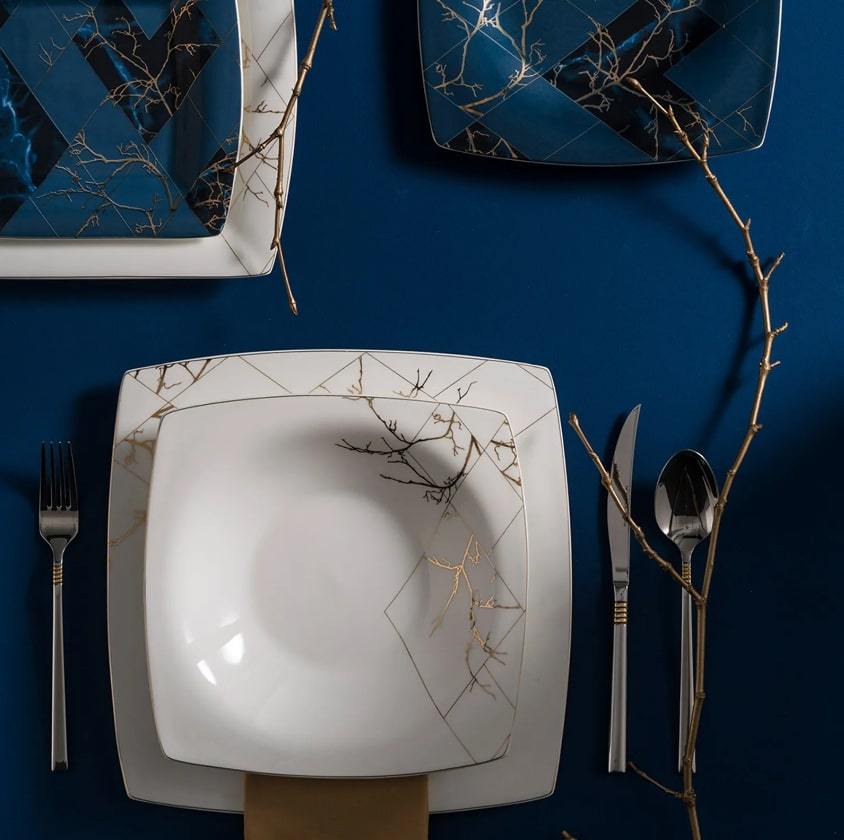 Dans une nuit profonde, les fines branches étincelantes au clair de lune ornent ce magnifique ensemble de service de table. L’union du blanc éclatant avec les nuances du bleu et les motifs dorés rend Karaca Fine Pearl unique en son genre. Vous pouvez trouver ce design uniquement dans la haute gamme de porcelaine, offert par Karaca Fine Pearl. C’est une première dans le monde, la série Karaca Fine Pearl contient de vraies perles. Sa blancheur éclatante, son design moderne et ses motifs dorés éblouiront les yeux de votre famille et de vos convives.