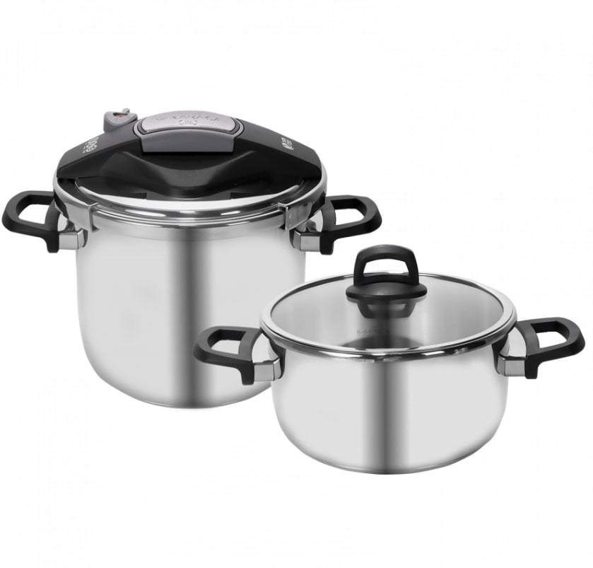 Original et très fonctionnel, ce set vous permettra d'utiliser la casserole de 6 litres à la fois comme cocote-minute mais aussi comme casserole profonde. De même la casserole de 4 litres peut être utilisée à la fois comme cocote-minute mais aussi comme casserole profonde. Ainsi vous avez la possibilité de choisir votre cocotte-minute selon la quantité de vos plats. Le couvercle à pression s'ouvre en appuyant puis en tournant le bouton au milieu. Grâce au système de sécurité, il assure une utilisation sûre et facile.