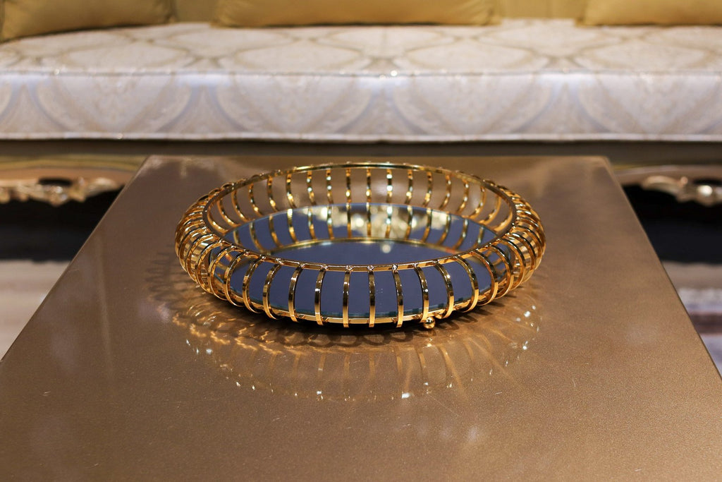 Plateau de service rond en métal de couleur doré avec miroir. Très élégant et décoratif. C'est un produit idéal pour servir des pâtisseries avec accompagnement thé ou café.