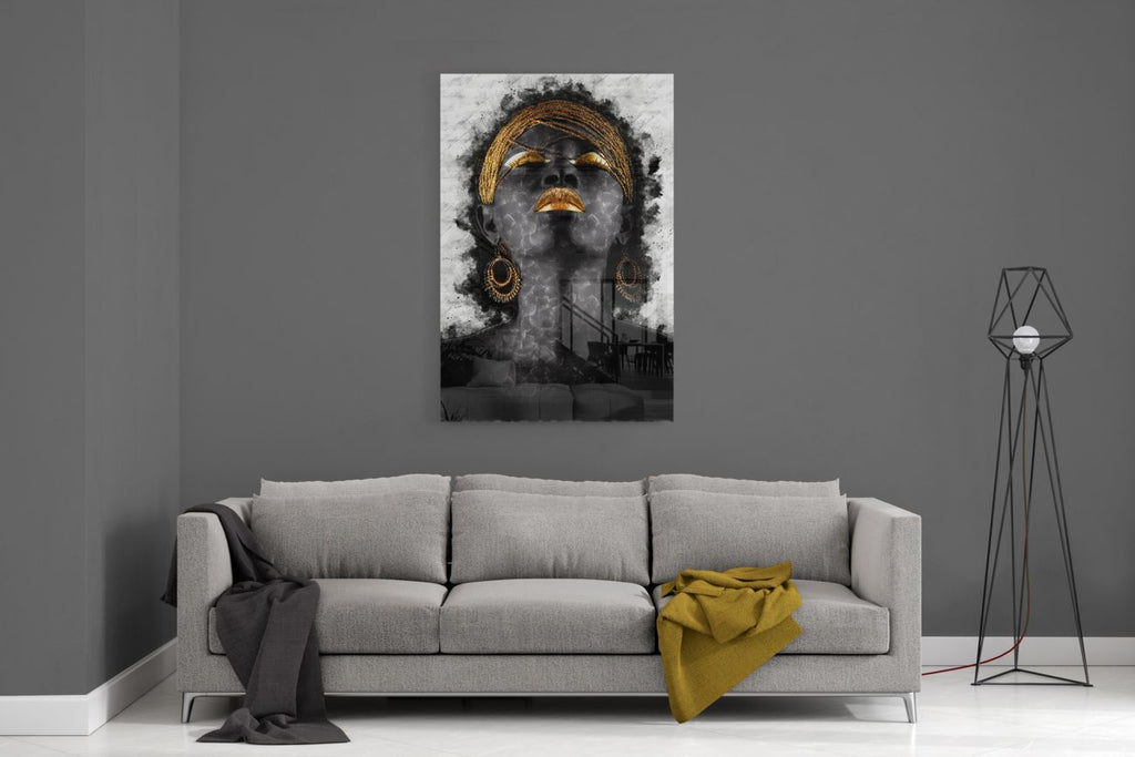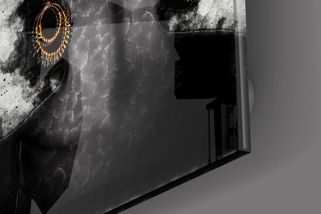 Ce tableau sur verre est une déclaration de design intérieur audacieuse qui combine l'attrait d'une impression photographique moderne avec la dureté et la brillance du verre. Elle représente une dame sensuelle parée de fils ethniques et de bijoux, elle est prise à mi-chemin alors qu'elle est en pleine sérénité dans des pensées profondes, sa peau brille. Les nuances monochromes de cet art mural photographique donnent encore vie à la chute des textures et des formes.