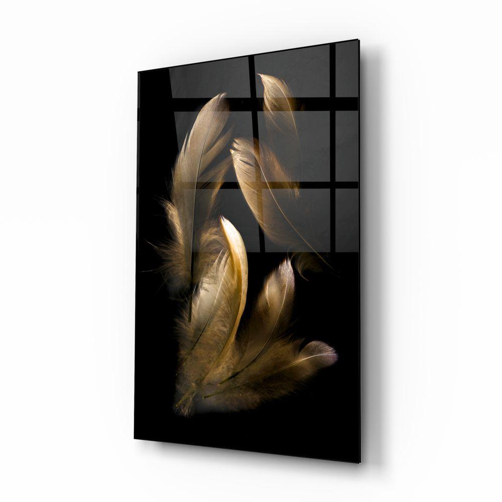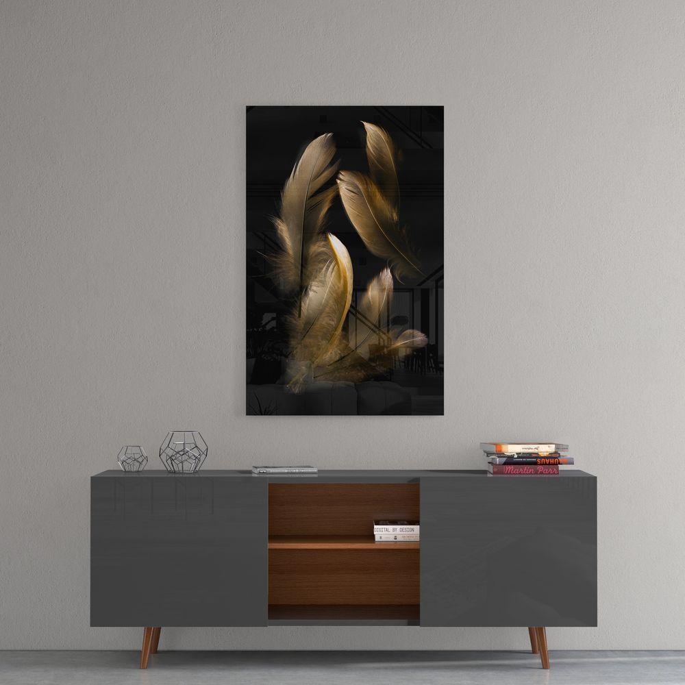 Ce tableau en verre est la pièce idéale pour compléter votre espace minimal. Créez un équilibre agréable dans votre maison ou votre bureau et accueillez cette belle impression d'art sur minimaliste représentant des plumes beiges, voir un peu doré tombantes sur fond noir.
